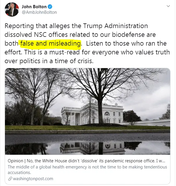 NOTHING "debunks" the FACT that Bolton disbanded the pandemic response team.
