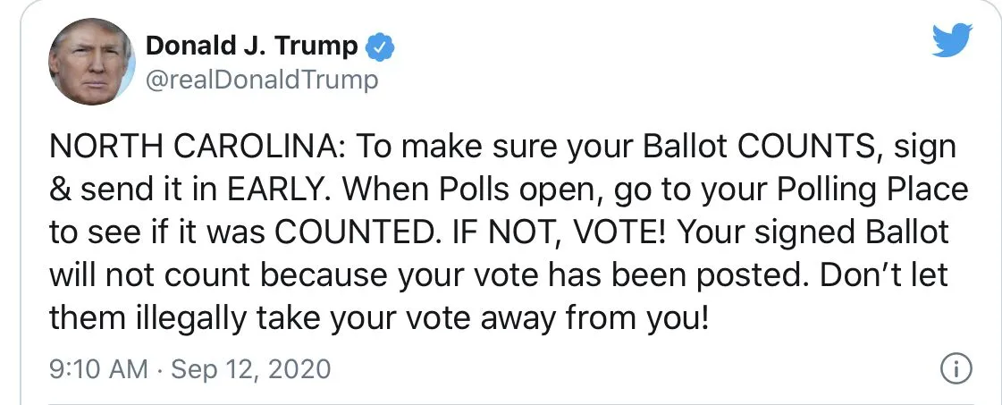 Wrong..the act itself is fraud.Only if both votes count...He is encouraging his voters to vote twice. That is fraud.So making sure your vote is received, and checking to make sure it was counted (and voting at the poll if it wasn't counted) is voter fraud???View attachment 387996