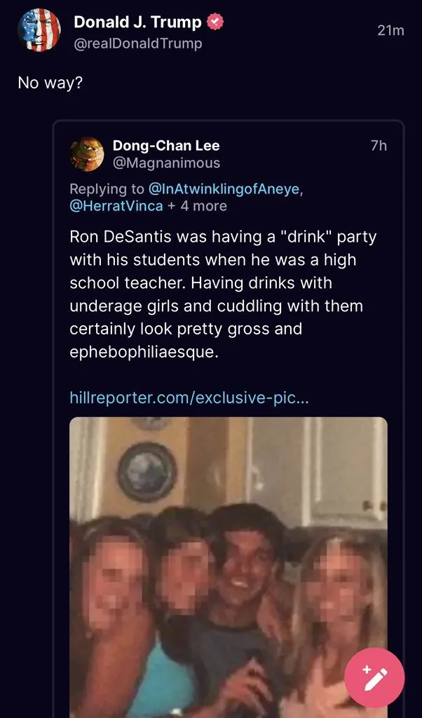 Are you claiming that Trump probably didn't post this on truth social or that the picture of DeSantis is fake?The source, a magazine that groomed generations of kids into marijuana use. It's the 2nd post so lefties must be drooling over it while they ignore Biden's daughter's diary entry that claims she was forced to shower with her father as a teen and it ruined her life.
