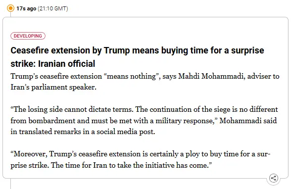 Look at this , just came in:Maybe, but I think he knows the Iranians aren't going to make any concessions until he forces them to. Maybe he's got new intel that indicates a better way to hit them and he needs time for his military to develop a strategy plan of attack. Or maybe this is political in nature, he's holding off in hopes of gaining some support both here and abroad for his next attack. It seems to be unavoidable IMHO, I don't see Trump declaring victory that nobody will believe is true and then walking away. Or maybe he just wants to surprise the bastards.