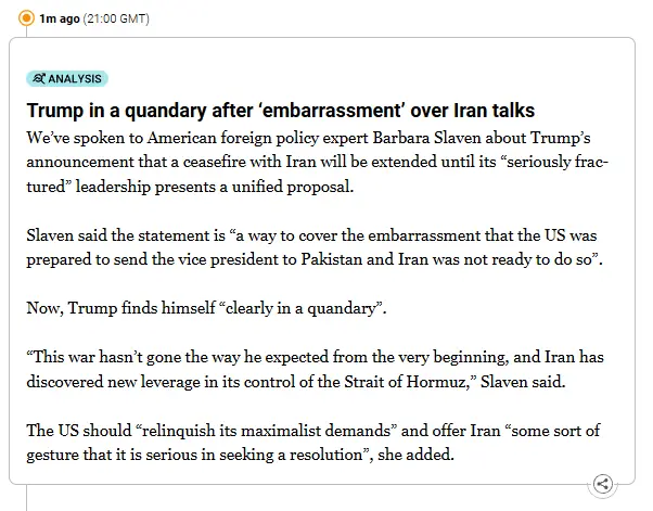 Trump said 4 hrs ago he would not extend the ceasefire, there was no time for it.We don't need to do that yet, the blockade is working just fine.