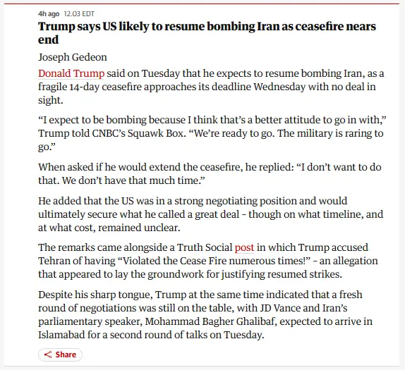 Cease fire is just a stall tactic. During the cease fire, a surge of additional U.S. forces are being deployed to the area. Forces are repositioning and resupplying.He's gone TACO again, the threat of Iran devastating Gulf facilities is just too much for trump to handle, so he's backed down.