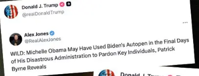The torrent swung between nostalgia – including a ‘Make Christmas Great Again’ video featuring Trump’s cameo in Home Alone 2 – and a parade of attacks on his usual Democratic targets, from California Governor Gavin Newsom and Rep. Nancy Pelosi (D-CA) to Rep. Ilhan Omar (D-MN) and former President Barack Obama. Among them was a clip of Alex Jones, featuring Bed, Bath and Beyond founder Patrick Byrne, whose video carried the bizarre caption: “Michelle Obama may have used Biden’s autopen in the final days of his disastrous administration to pardon key individuals.” Other posts lauded his vow to nullify all of Biden’s Autopen orders.