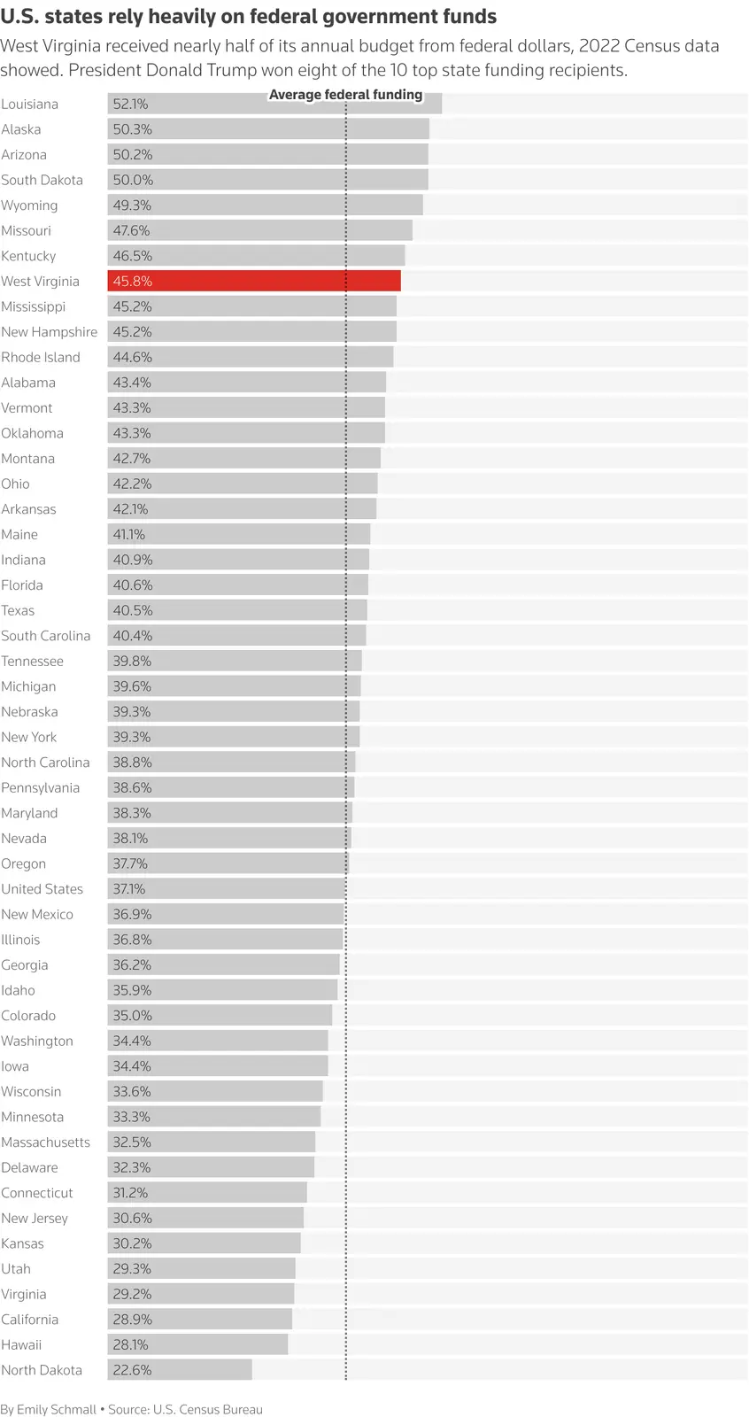 Along the winding back roads and Appalachian hollers of West Virginia, in a state where Trump won 70% of the votes cast in November, his administration's vow to cut back on government spending is being keenly felt.