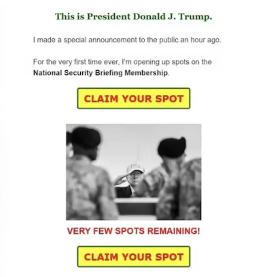 The embedded photo of the dignified transfer, taken by White House photographer Daniel Torok, is included in the email and bracketed by icons featuring the text, “CLAIM YOUR SPOT,” which can be clicked on to donate.