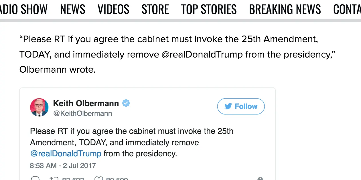 That idiot Oberman wants to INVOKE the 25th amendment, the guy is a moron and sounds like a whiny crying little *****. He's is a huge loser. Another one who needs sent to N. Korea. That loser doesn't deserve to be an American.