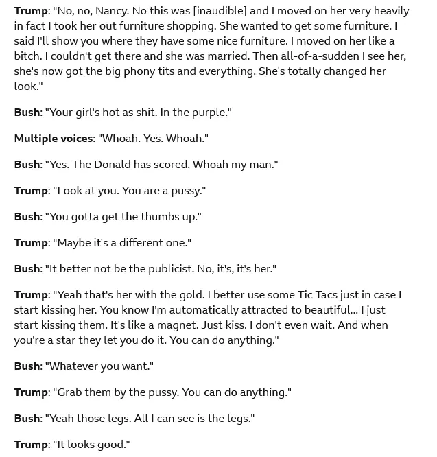 The full transcript of the conversation between Donald Trump and a TV host in 2005 in which the US presidential candidate made obscene comments about women.www.bbc.com