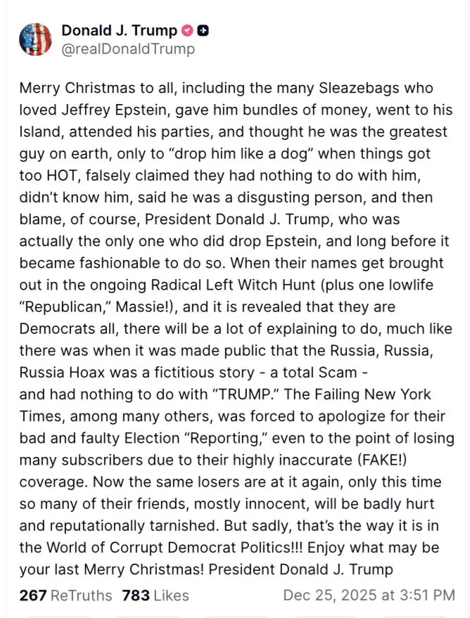 President Donald Trump attacked people he described as "losers" and "sleazebags" in a dark screed on social media on Christmas night. In the post, Trump attempted to distance himself from disgraced financier Jeffrey Epstein, someone he has previously referred to as a close friend. This comes at...