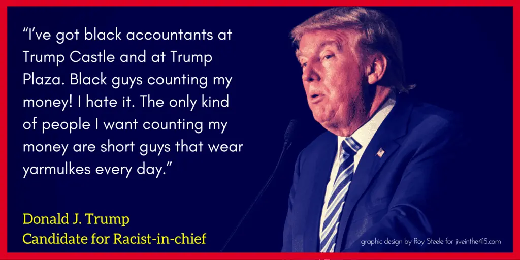 I couldn’t believe I was hearing this. But Donald went on, “Besides that, I’ve got to tell you something else. I think that the guy is lazy. And it’s probably not his fault because laziness is a trait in blacks. It really is, I believe that. It’s not something they can control. … Don’t you agree?”
