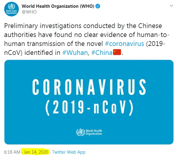 And on January 14, WHO said that coronavirus is not transmitted from person to person. Media followed that disinformation from China, and encouraged people to go on with their normal lives.