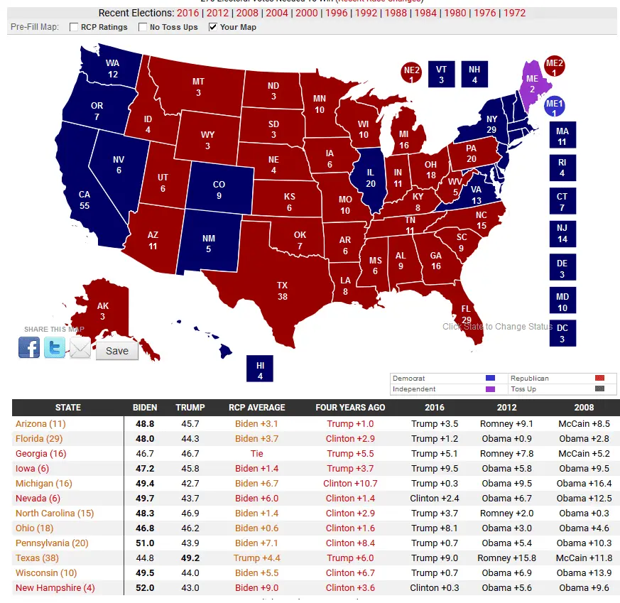 The poll was completed after the news broke that President Trump and his wife Melania have been infected by Covid-19.But 68 percent said the illness would not affect their vote while 19 percent said they were “more likely” to support Trump and only 13 percent “less likely”.Almost two thirds said they felt sympathy and concern for the President while 38 percent said him getting the disease was “karma” in an indication of the current divisive nature of US politics.Crucially, Mr Trump’s lead in key swing states including Florida, Iowa, Michigan, Minnesota, Pennsylvania and Wisconsin remains at 4 percent by 47 percent 43 percent.This gives a projected Electoral College split of 320 to Trump and 218 to Biden.