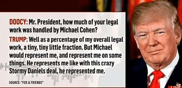 He said on FIX news that Cohen did very little legal work for him. He is claiming the man that fixed numerous adulterous affairs a nobody. He called the man who set up the collusion with Russia a business partner.
