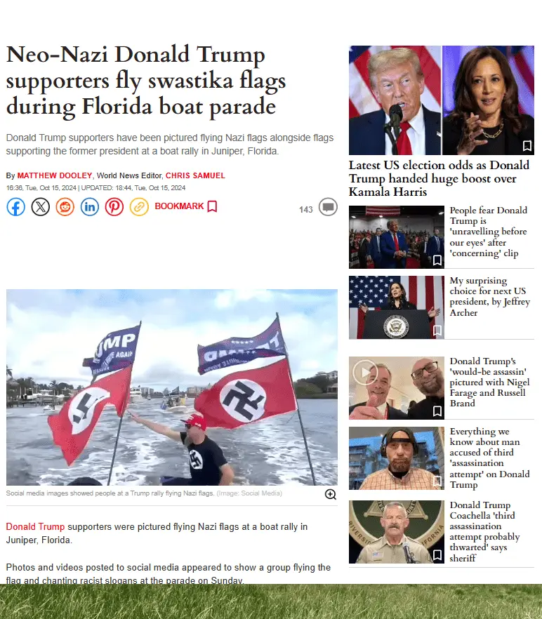 "Trump-Loving Neo-Nazis Crash MAGA Boat Parade"In case there are any lingering doubts about the human filth that eagerly support Trump, this is the nature of the MAGA beast, these are the cockroaches that are crawling out gleefully in the hope he will win and begin a new era for the United States and unbridled fascism.