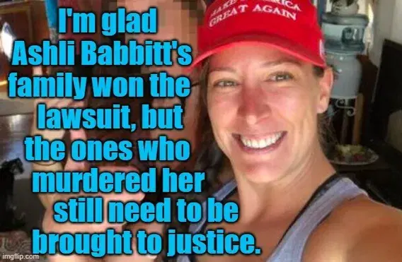 WTF are they getting a settlement for anyway? She was killed while committing a felony.So after all the screaming about how Ashli Babbitt was murdered, the Trump Administration low-balled the settlement down from the 30 million her family was asking for, to a mere 5 million, which probably won't even cover the lawyer's fees.