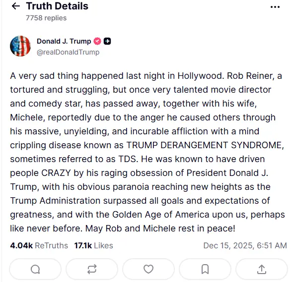 Reiner (RIP) was in advanced stages of TDS, even more than you.Even for Trump, this is shocking. The level of narcissism this man exhibits is borderline psychotic. I don't know how anyone in his family or inner circle can stand idly by while he does stuff like this.