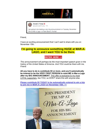 Trump is getting desperate. I am an anti-Trumper and he wants me at Mar-a-Lago for a big announcement. There must not be enough Trump minions showing up.