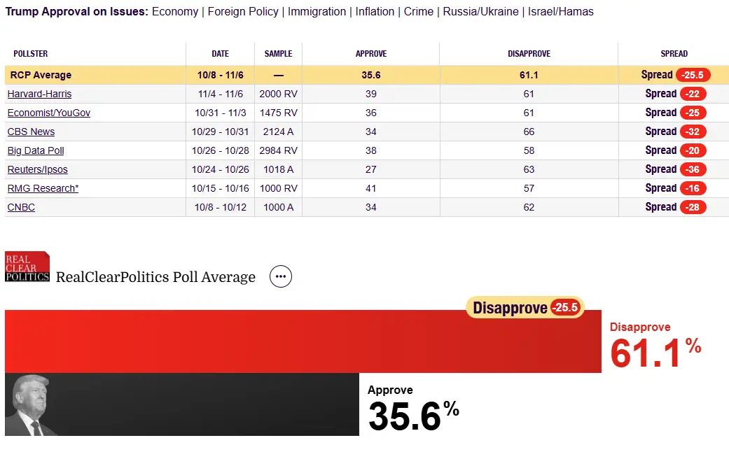 The Associate Press had Ubercunt up by 12 points on Trump back in 2016. Just over a week before the election.I imagine the Epstein revelations aren't helping much. Trump's approval now sits at only 36%, not even a year into his second term. His approval on the handling of the economy is even lower at 33%. The economy dominated last week's elections and will certainly be a mitigating factor in next year's midterms. The Republican Party is headed towards a midterm bloodbath that will rival 2018 if this is not turned around and I don't see how it can be at this point. Trump's reputation is beyond repairing and the impression of Vance, his heir apparent, is even worse.