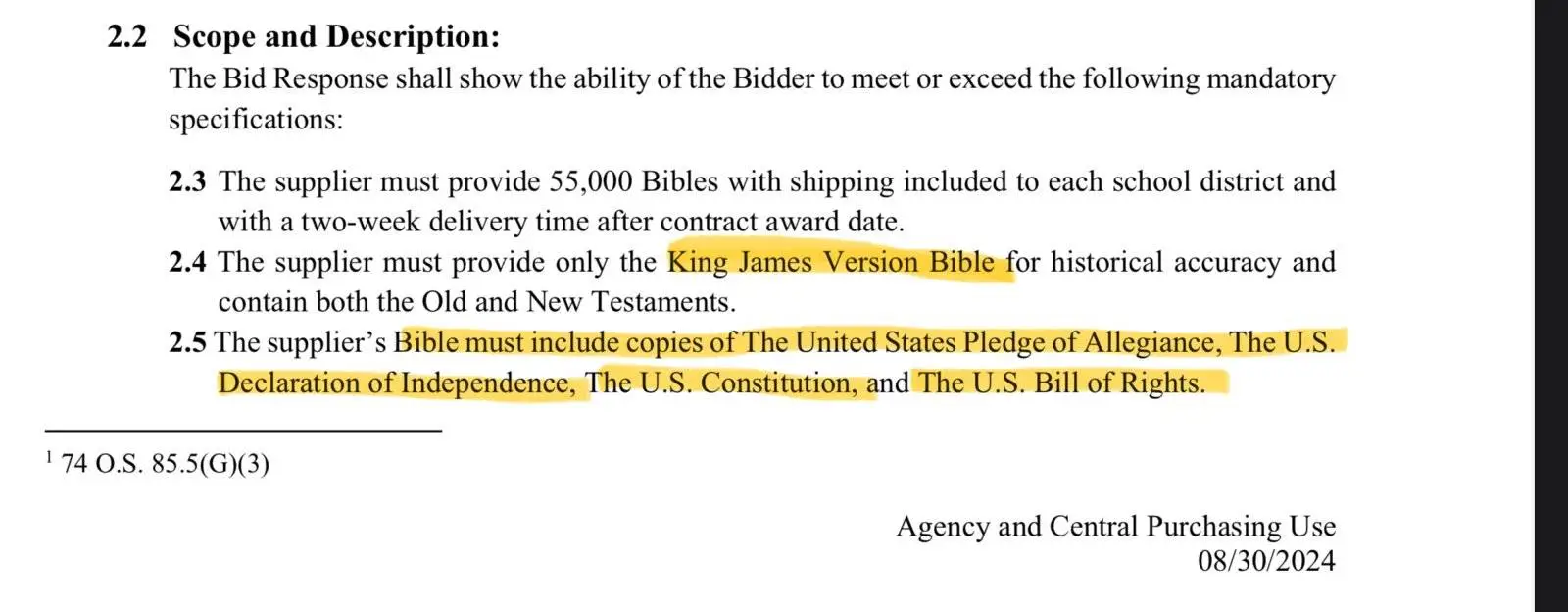 Bids opened Monday for a contract to supply the state Department of Education with 55,000 Bibles. According to the bid documents, vendors must meet certain specifications: Bibles must be the King James Version; must contain the Old and New Testaments; must include copies of the Pledge of Allegiance, Declaration of Independence, U.S. Constitution and the Bill of Rights; and must be bound in leather or leather-like material.