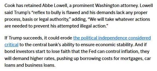 The difference is there's no cause for Powell. Policy differences don't constitute cause. Mortgage fraud does.Yep, I agree, she's black and Powell's white, she's got a big problem.