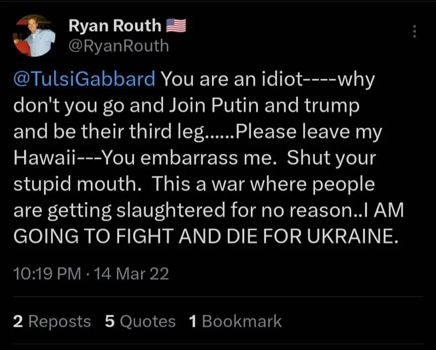 He is a Republican who hates Russia. Loves Vivek and Nikki but hates Tulsi and Trump which are two lefty Republicans that support Russia.