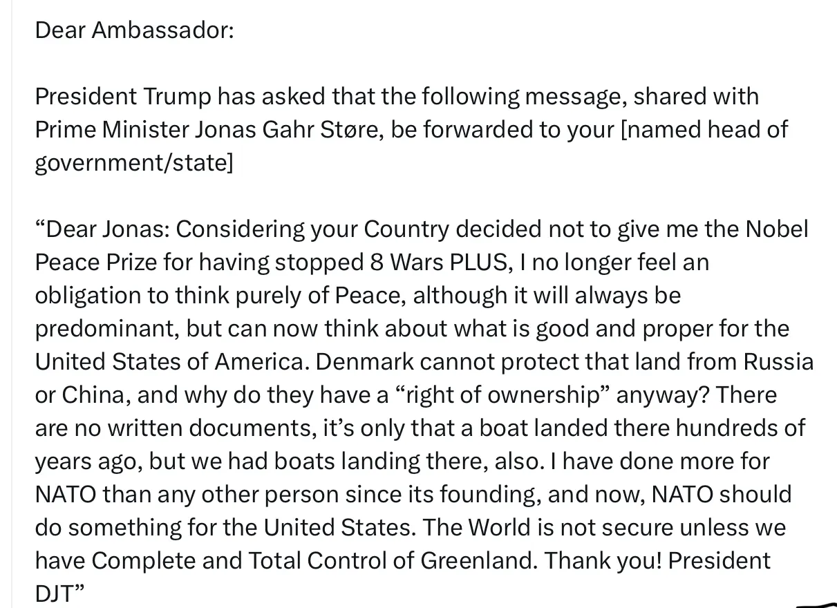 All I can say is we have a friggin lunatic as president of the US. Is Trump saying he will now start wars because he was snubbed? Is Trump now saying that he will use military force to seize Greenland because he was not awarded the Nobel? Will Americans be sent to die in a foreign war because that child was denied a Nobel?