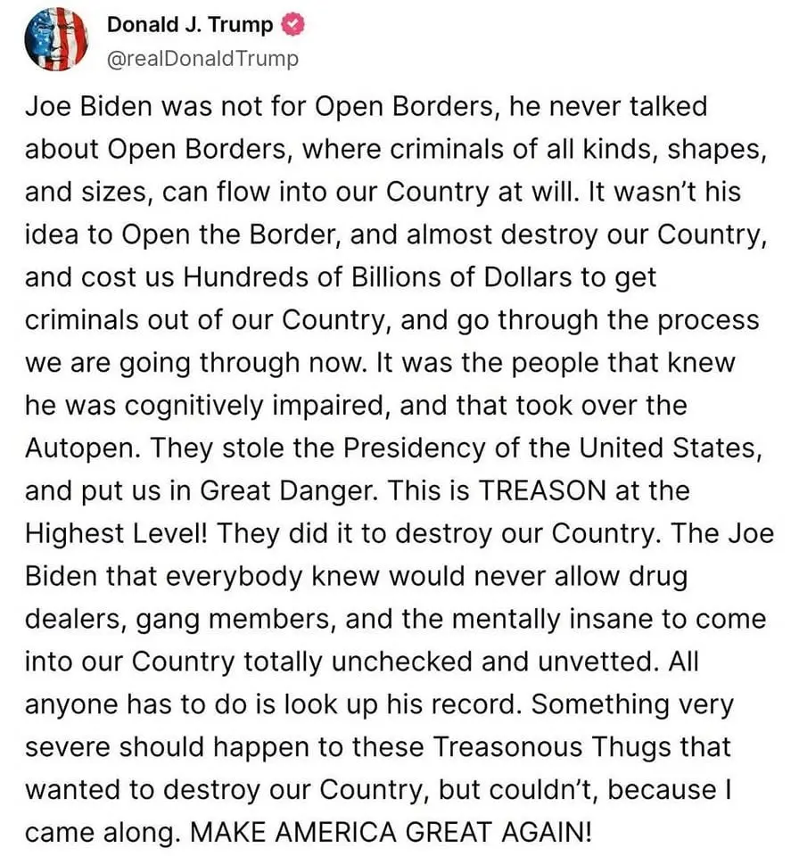 He’s right it’s the demafacist that took advantage of a senile man. Americans can’t forget that xiden was merely a puppet the last four years, destroying our country is the agenda of the entire Demafasict partySo Trump is letting Biden off the hook, the same as he let Hillary off the hook. $1 says Trump supporter won't hold Trump accountable for this either.