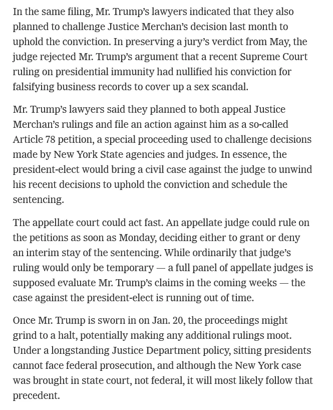 Although that request is most likely doomed — the judge, Juan M. Merchan, was the one who scheduled the sentencing — Mr. Trump’s lawyers disclosed in the filing that they planned to escalate their effort. If the judge does not pause the sentencing by 2 p.m. on Monday, the filing said, Mr. Trump will “seek an emergency appellate review.”