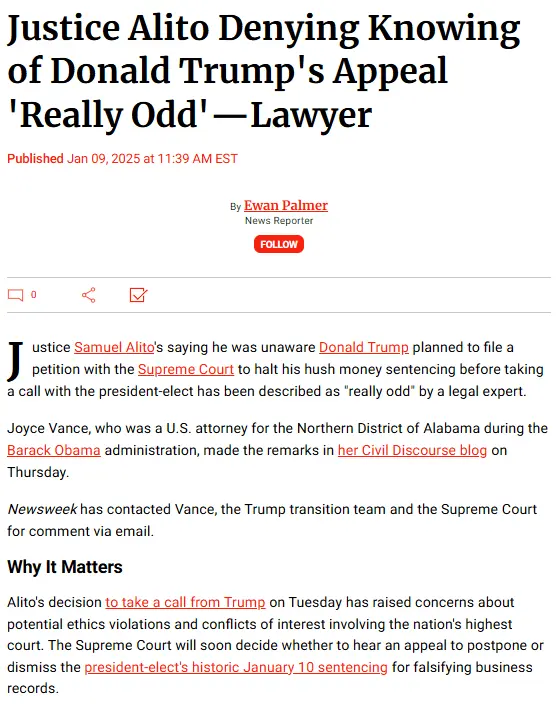 Writing in her Civil Discourse blog, Vance said it was "really odd" for Alito to suggest he did not know Trump would seek Supreme Court intervention, as "the whole rest of the legal world" expected it.