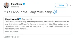 Its all about the Benjamins is a well know antisemitic slur used against Jews as implies greed. Man are you ignorant. And yeah it is antisemitic to question the one and only Jewish nation that is the safest place in the middle east for a woman or a gay man for that matter. Funny how she doesn't attack KSA, Iran or Iraq or Hamas for their human rights violations.Normally, I'd need a link to the actual comments since some random jpeg you dropped could fabricated but I did the leg work and looked up the comments and they appear to be genuine. I get the context with which she made the comments and still see nothing wrong with them but she clarifies the context of those comments here: