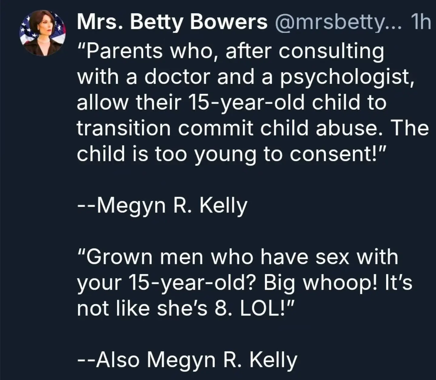 What’s sad and sick is your can’t answer the question and think 15 year olds are the same as five year oldsFigures you and Megyn are standing up for screwing 15 year olds.