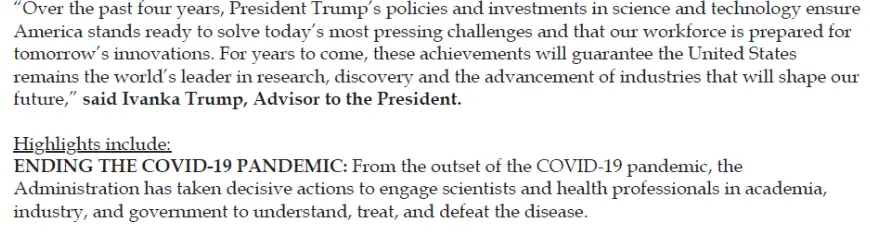 The Trump administration statement came in a press release from the White House Office of Science and Technology Policy, which was accompanied by a 62-page report detailing scientific highlights during Trump’s tenure as president.
