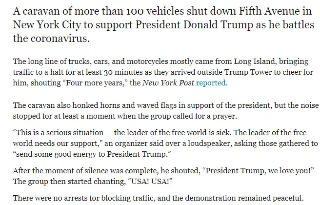 That's nice. But now that it's know he never had Covid 19 I wonder if there are any of those 100 that feel foolish now. Or betrayed? Probably not. Cult45 never does. They guy into the Hucksters Con.