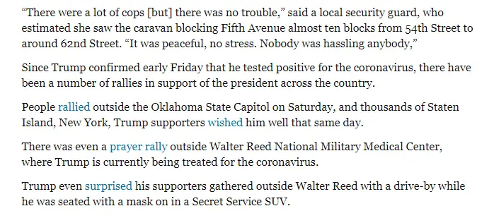 He's a fake. Another case of him attempting to ride on other peoples glory. I called it right on the button. He never had Covid. Not Covid 19, not even Covid 1 or 2. He noticed that his rating were bargain basement. This is his October Surprise he scheduled 2 months ago. Unless you didn't care, you don't get over Covid 19 in a couple of days. You are out of action for a couple of weeks at the least. Now, if he were 19, he may have had a mild case and have gone though most of those 2 weeks outside the hospital but he's 74. That means he's out for at least 2 weeks. And that is if he's not Obese, which he is. Or he doesn't have any other medical problems which he probably does like every other 74 year old no matter how healthy they seem.