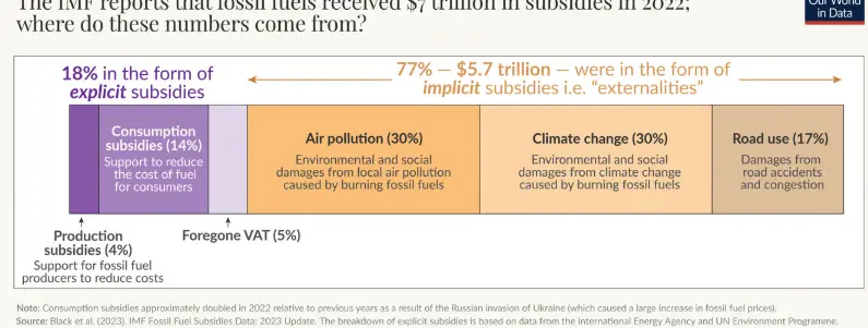 Because subsidies can be defined in different ways — production, consumption, explicit, implicit — people can quote very different numbers to this question, ranging from hundreds of billions of US dollars to as much as $7 trillion (ten times as much).