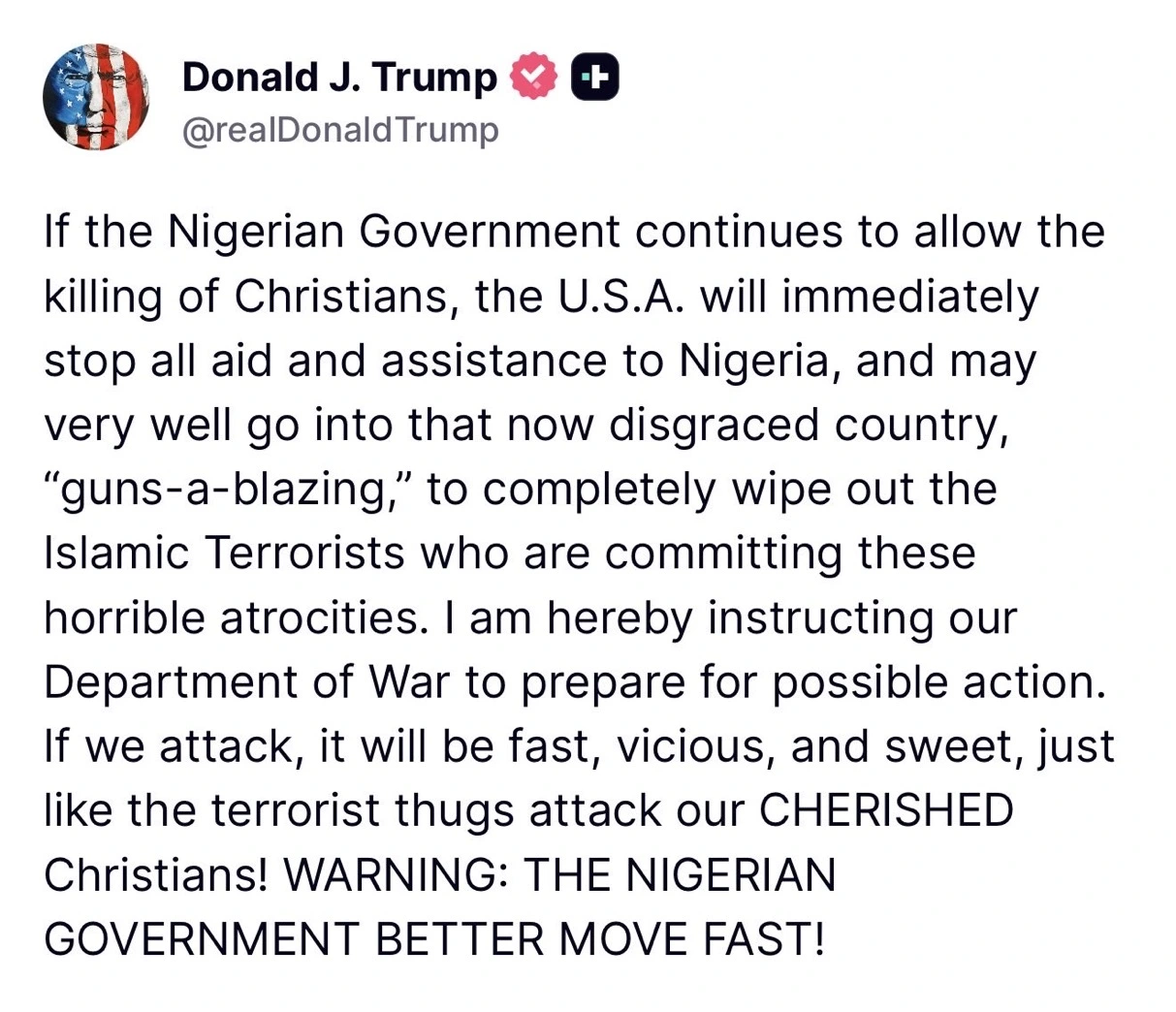 “US President Donald Trump has threatened to carry out attacks in Nigeria in response to purported anti-Christian violence, saying he instructed the recently renamed Department of War to “prepare for possible action”.