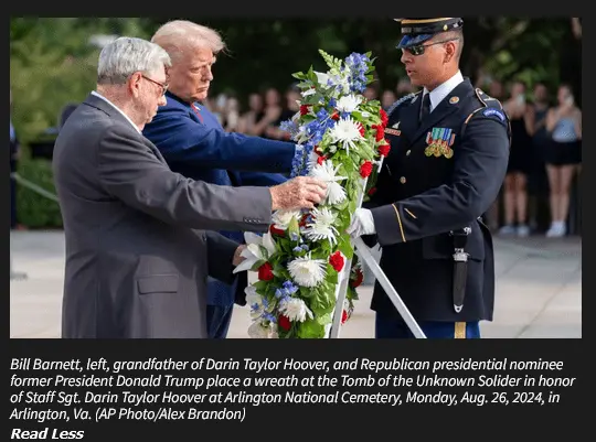 Irrelevant to the laws regarding usage of the Arlington grounds.After Biden/Harris' moronic withdrawal from AFG killed those 13 young Americans neither Biden nor Harris had the decency to call the families to offer condolences. Trump was there and even called the family members who could not attend.