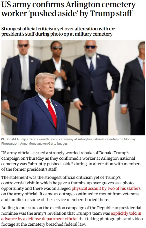Trump defends Arlington cemetery visit; Harris says she would appoint Republican to cabinet if elected – as it happened