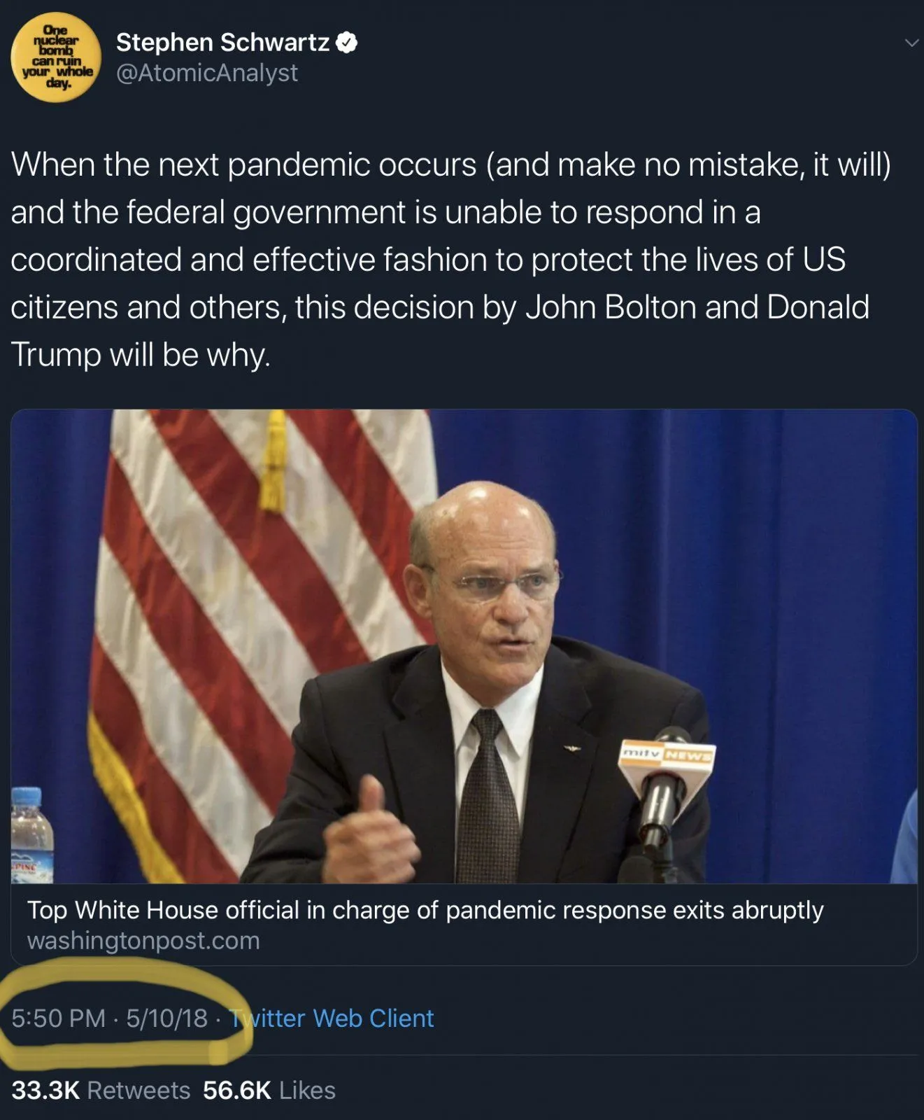 I think our CDC was blindsided. There’s going to be a lot of analysis on this for years to come. Hopefully Republicans decide that oversight of the executive a thing they want to do again. The degree to which China’s obfuscation affected us is sadly going to be next to impossible to determine and is going to unfortunately become a Rorschach test.