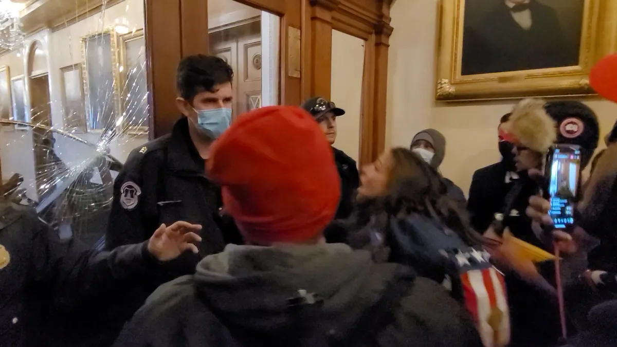 That picture shows an unarmed woman. And it doesn’t show the cops that were within close enough distance to her. Your way offThat was prior to them being ordered away and before the mob broke completely though the windows and prior to the SWAT team arrival post shooting.