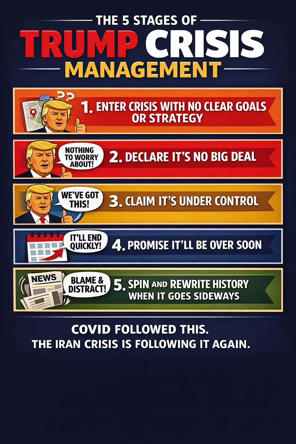 Trump has no idea how to handle a crisis. The Iran crisis management is following the same pattern as covid crisis management: