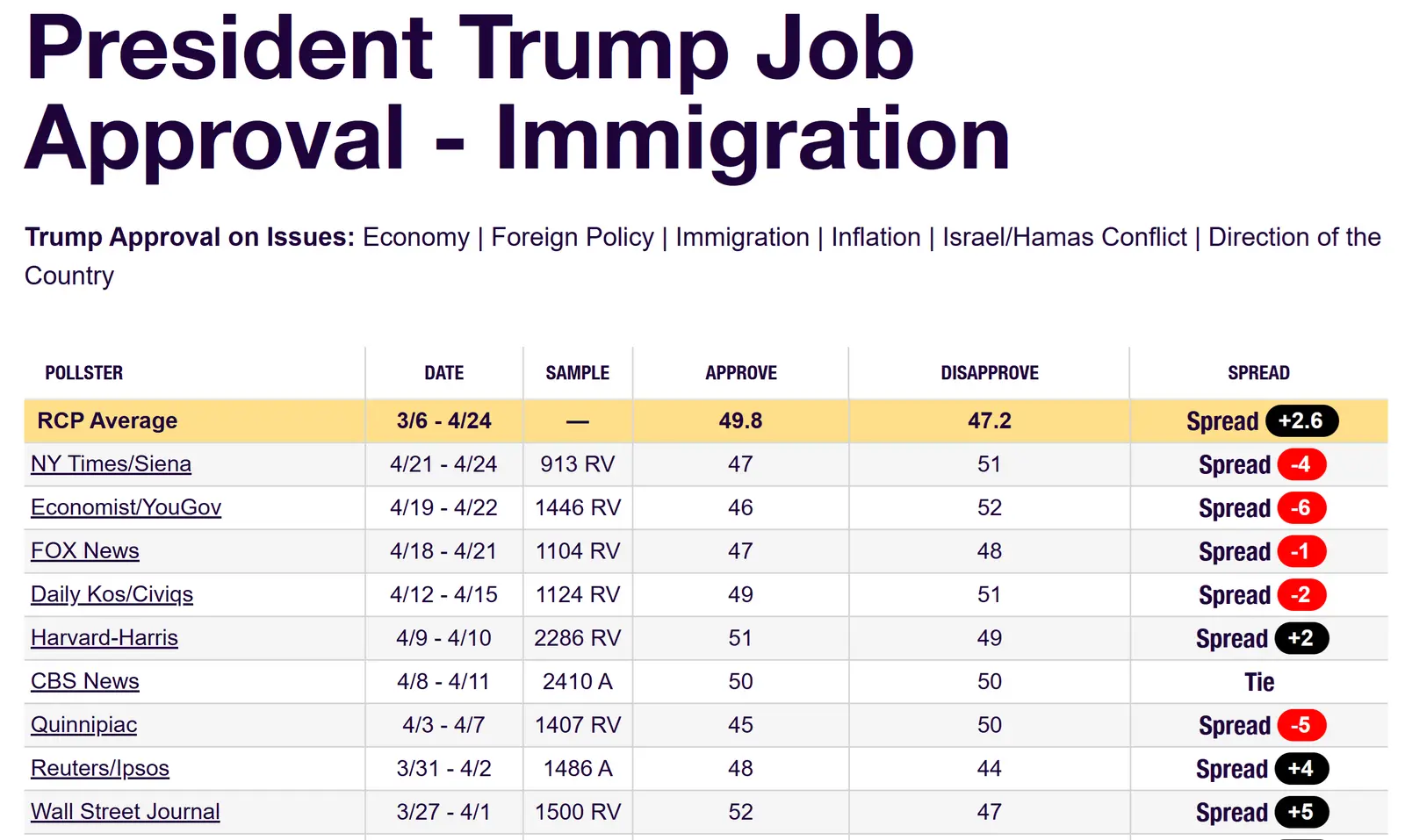 I saw as high as a 63 on the border and deportation.Looks like the RCP average of 49.8 is just like 50% approval and within the margin of error.