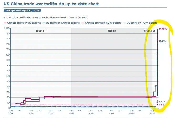 Tariffs in single digits when Trump becomes president. He raises them to nearly 20% in first term which is higher than China’s. Then 92% of all tariff money gets funneled to farmers and the US keeps almost nothing. Then he gets into office a second time, calls his own tariffs stupid and makes them 145% killing all business because it was last minute and business have already bought or issued legal purchase orders for goods.What do you make of the chart?