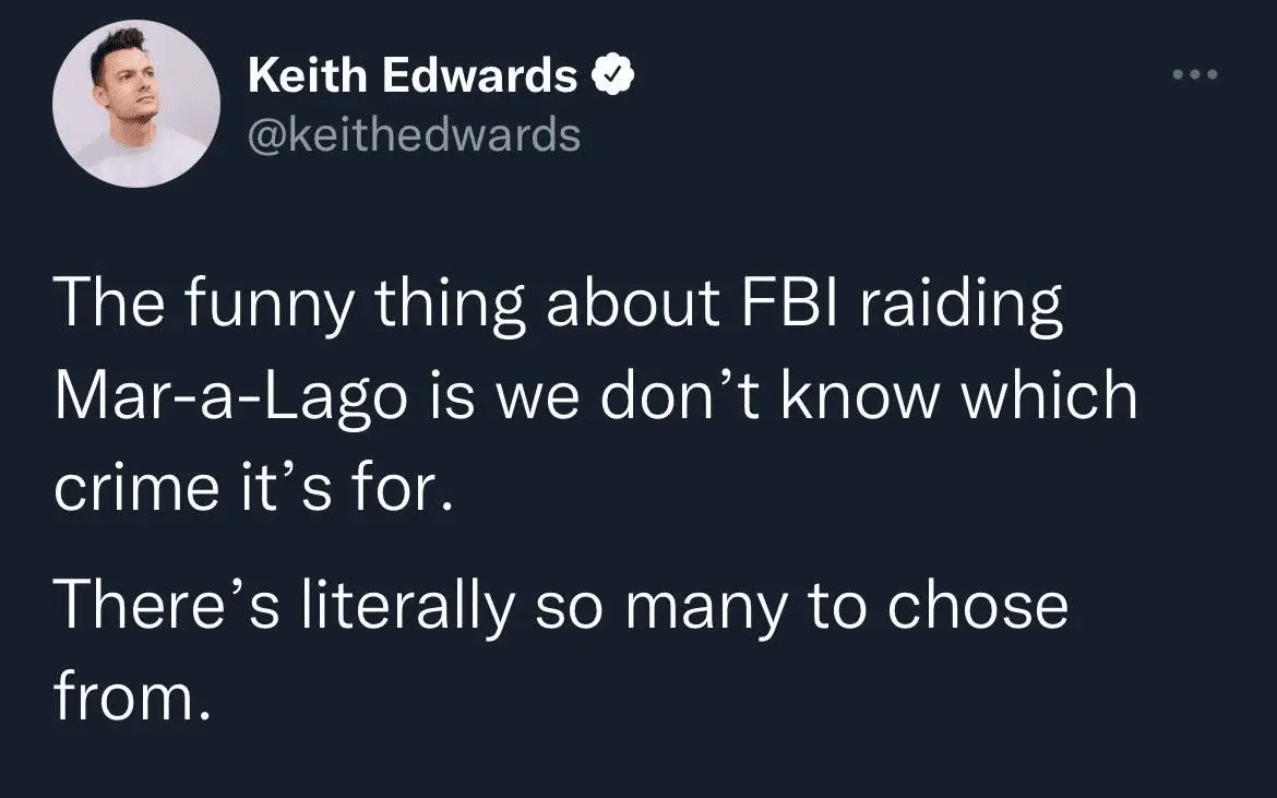 You’re arguing from a weak position, given a) how Hillary got away destroying evidence, including classified information, and b) how the FBI hid the story of Hunter’s laptop (and the 10% to The Big Guy) by calling it Russian disinformation and turning the election to Biden.But using law enforcement to exercise a search warrant sign by a judge in good standing is the American way. Trump is not above it. If he kept documents, the government is entitled to get them back.