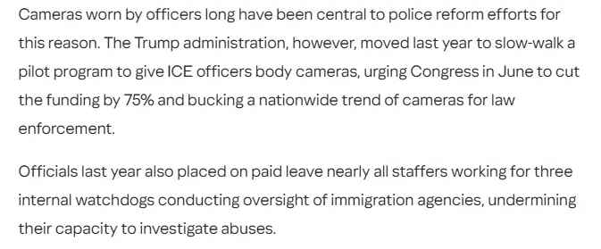 "Cameras worn by ‌officers long have been central to police reform efforts for this reason. The Trump administration, however, moved last year to slow-walk a pilot program to give ICE officers body cameras, urging Congress in June to cut the funding by 75% and bucking a nationwide trend ‌of cameras for law enforcement."