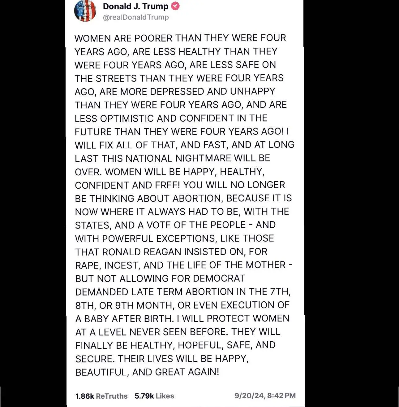 This was his 11:42 late night rant. Not only is it unhinged and entirely untrue he tells women in all caps that since their rights can be taken away at the state level they have nothing to worry about.