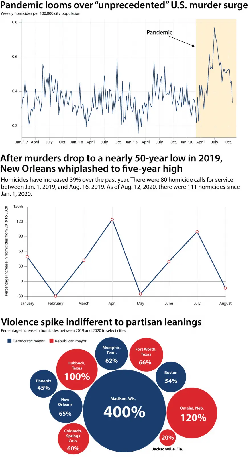 For all its singular tragedy, Ms. Nguyen’s death is part of a tide of gun violence rising from New Orleans to Lubbock, Texas. Coming off a record low in homicides in 2019, New Orleans saw its rate spike by over 50% this year. It is not, by any stretch, an outlier. Lubbock doubled its murder rate, so far, from 2019 to 2020.