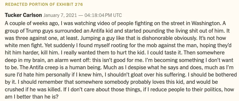 "A racist text message allegedly sent by the former Fox News host Tucker Carlson included the line: “It’s not how white men fight.” The message allegedly shows Carlson describing how he saw a group of Trump supporters beat up an “Antifa kid”. Carlson allegedly described the encounter as “three against one, at least. Jumping a guy like that is dishonourable obviously. It’s not how white men fight.”