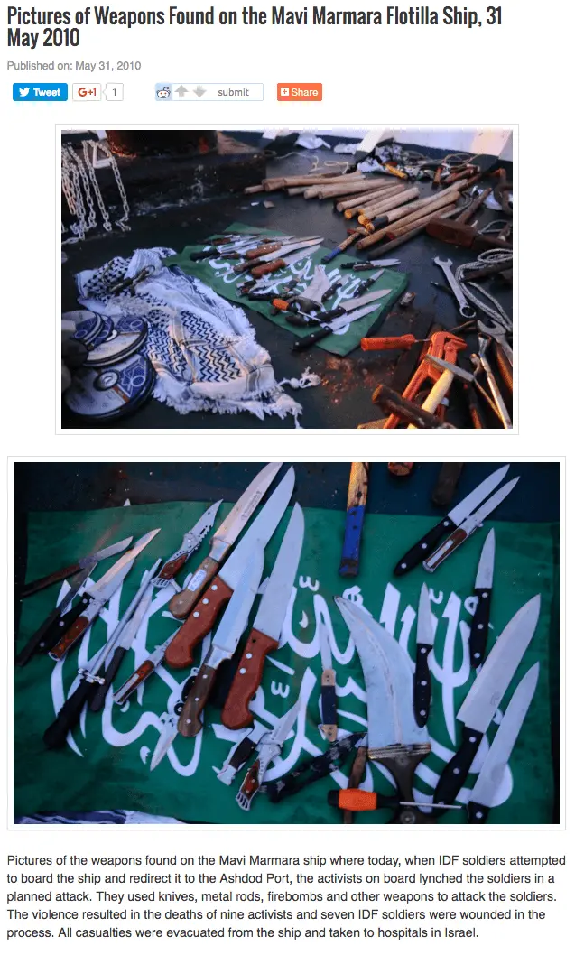 Another fact is that Israel knew that there were no weapons aboard to Gaza. There was no military necessity for the attack. The flotilla was no threat to Israel.