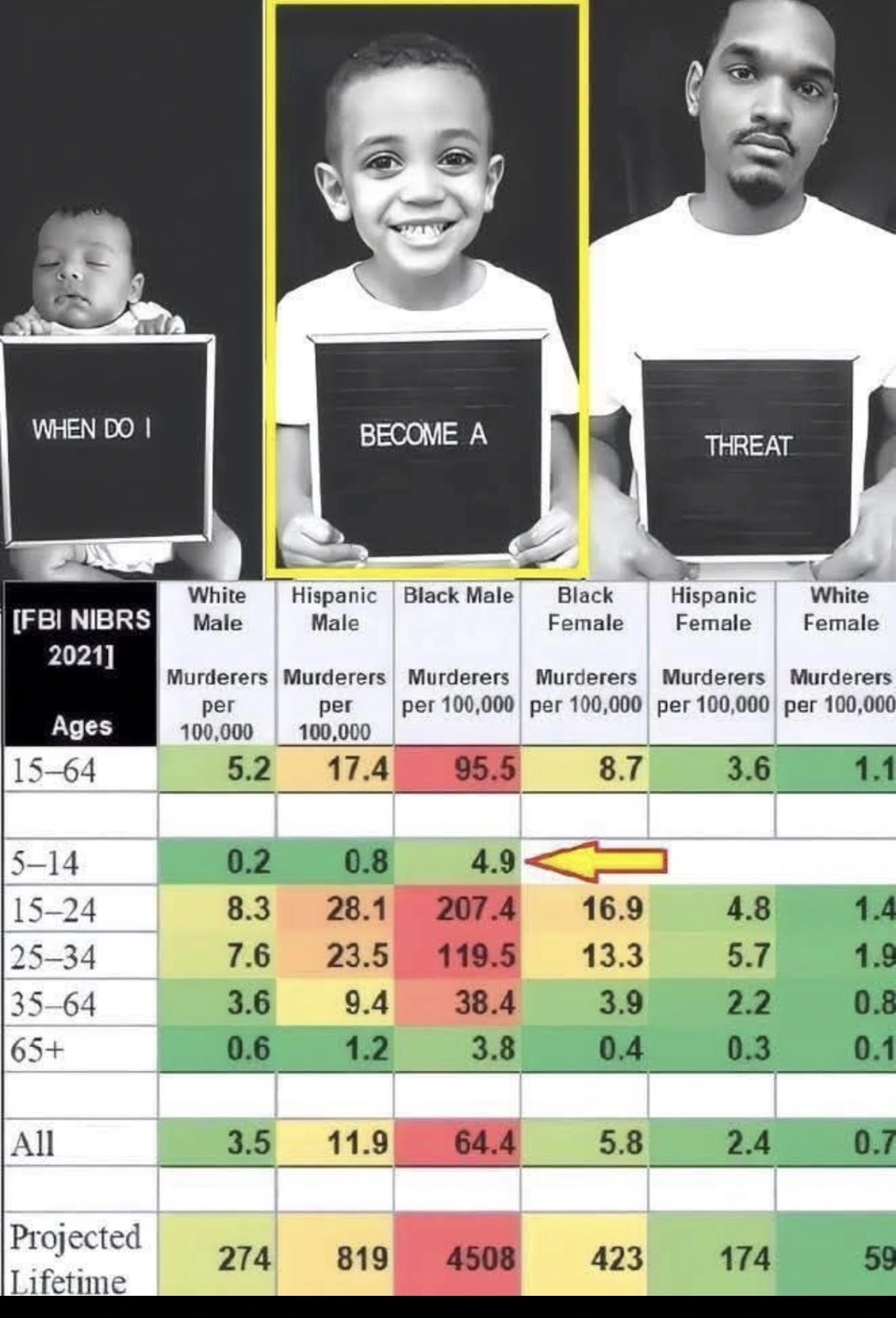 Point of fact, black children aged 5-14 are more likely to commit murder than a white man above age 35: