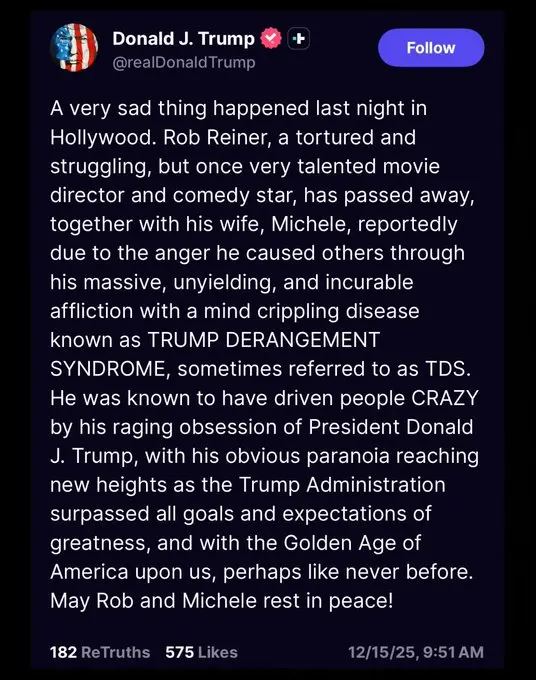 YOU just claimed Trump's tweet was on target. I didnt tweet that out on his death. Kirk was a terrible human but to say that on the day he died or just after, is basically saying its ok he is dead. We are out of that window. Not for Rob Reinhart though, especially if you are the president tweeting the day of his death.You just put yourself in the same space you claim Trump is in.